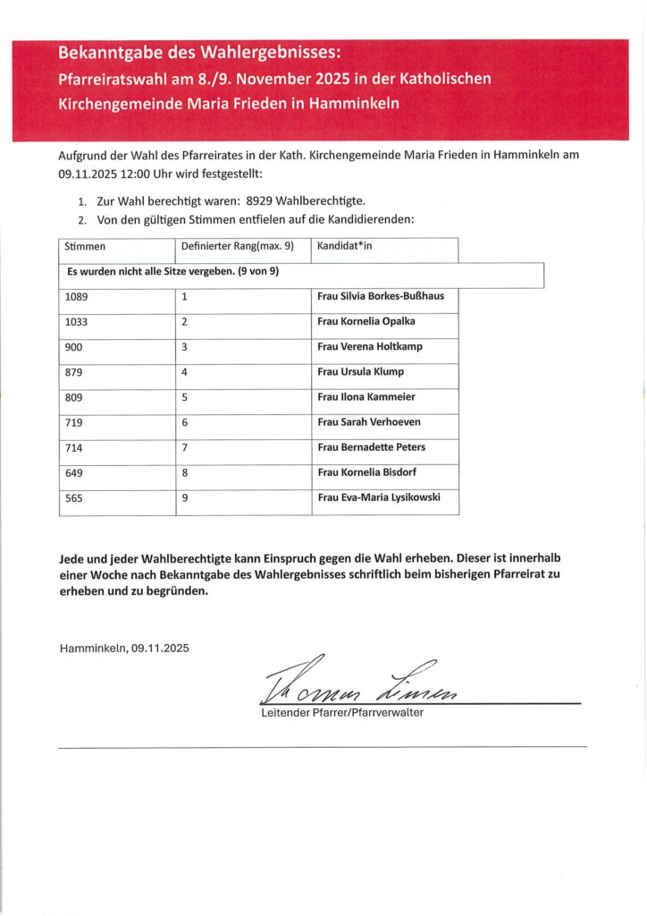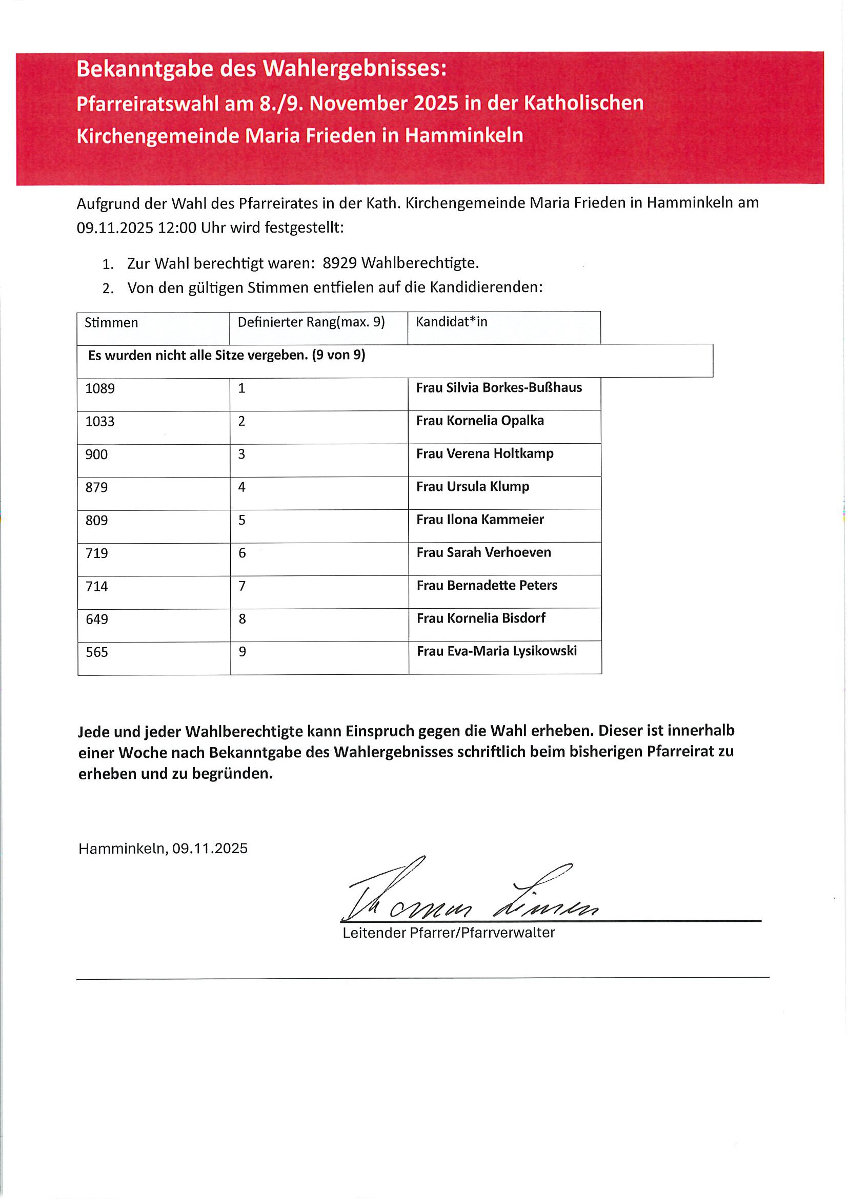 Kirchenvorstands- und Pfarreiratswahl 2025: Bekanntgabe der Wahlergebnisse