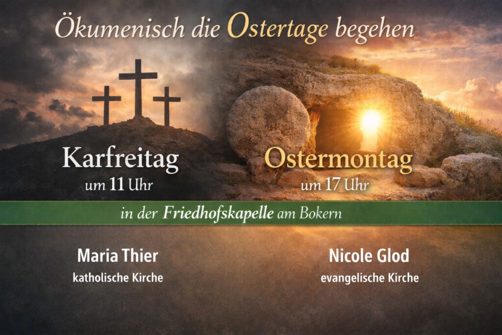 Die ökumenischen Gottesdienste finden in Dingden in der Friedhofskapelle am Bokern statt, und zwar am Karfreitag um 11 Uhr und an Ostermontag um 17 Uhr.